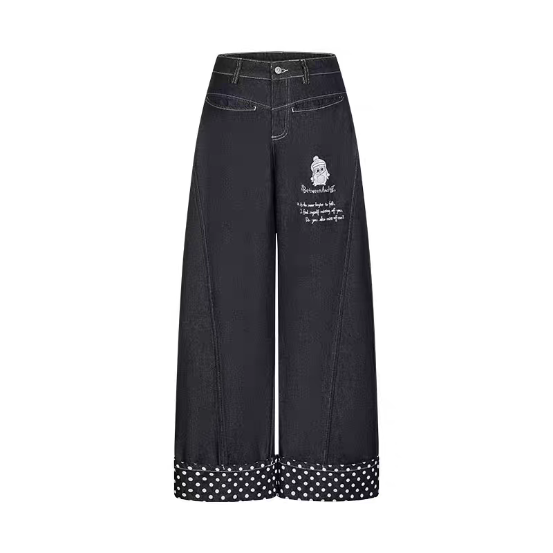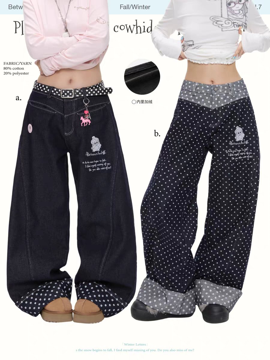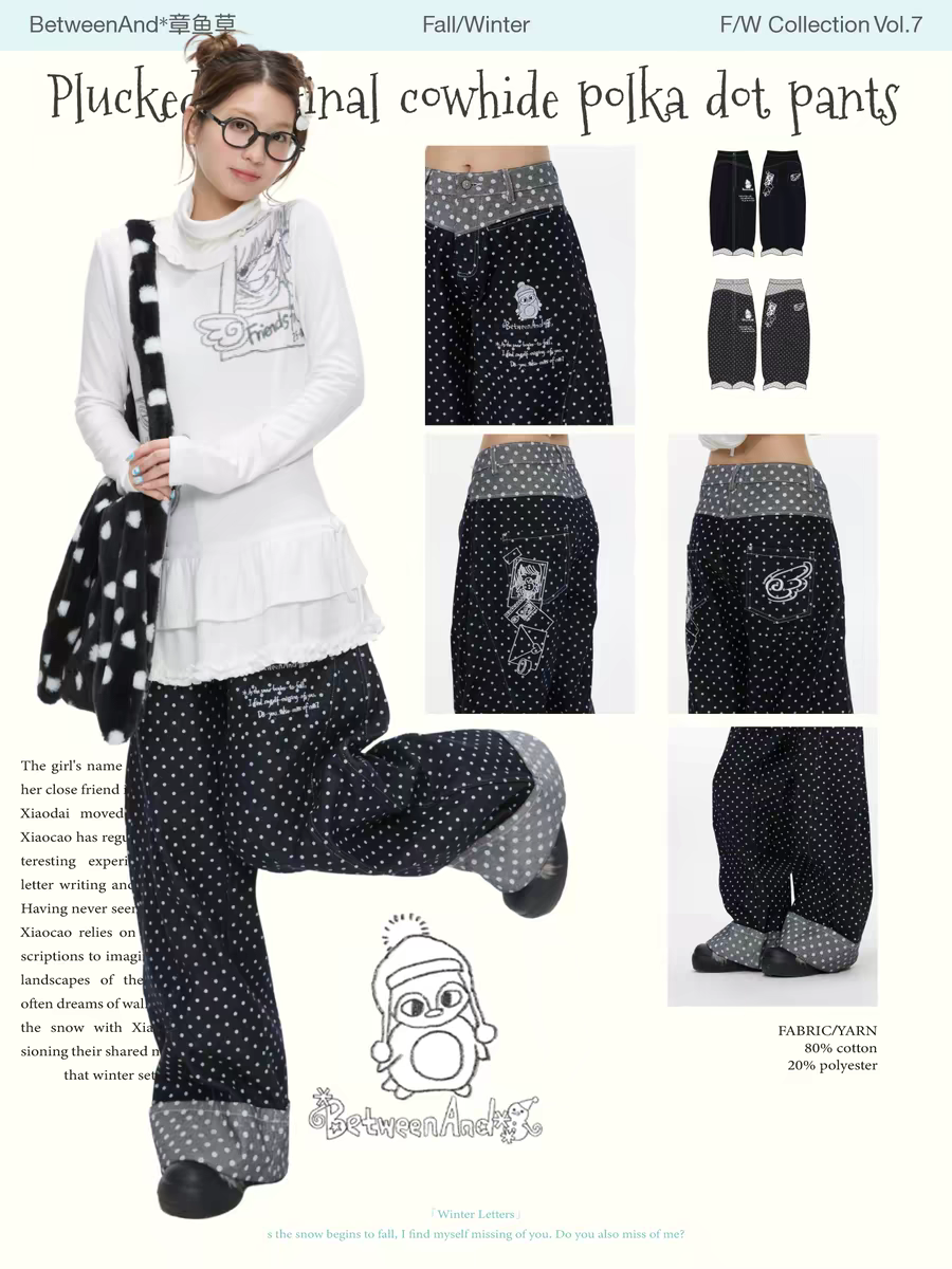 Джинсы BETWEENAND «Снег Хоккайдо» с вышивкой пингвина. Доступны два варианта: стандартный и в горошек. Параметры модели: • Ai: рост 166 см, вес 43 кг, размер на модели M • Chaochao: рост 163 см, вес 44 кг, размер на модели M Состав: • 80% хлопок, 20% полиэстер