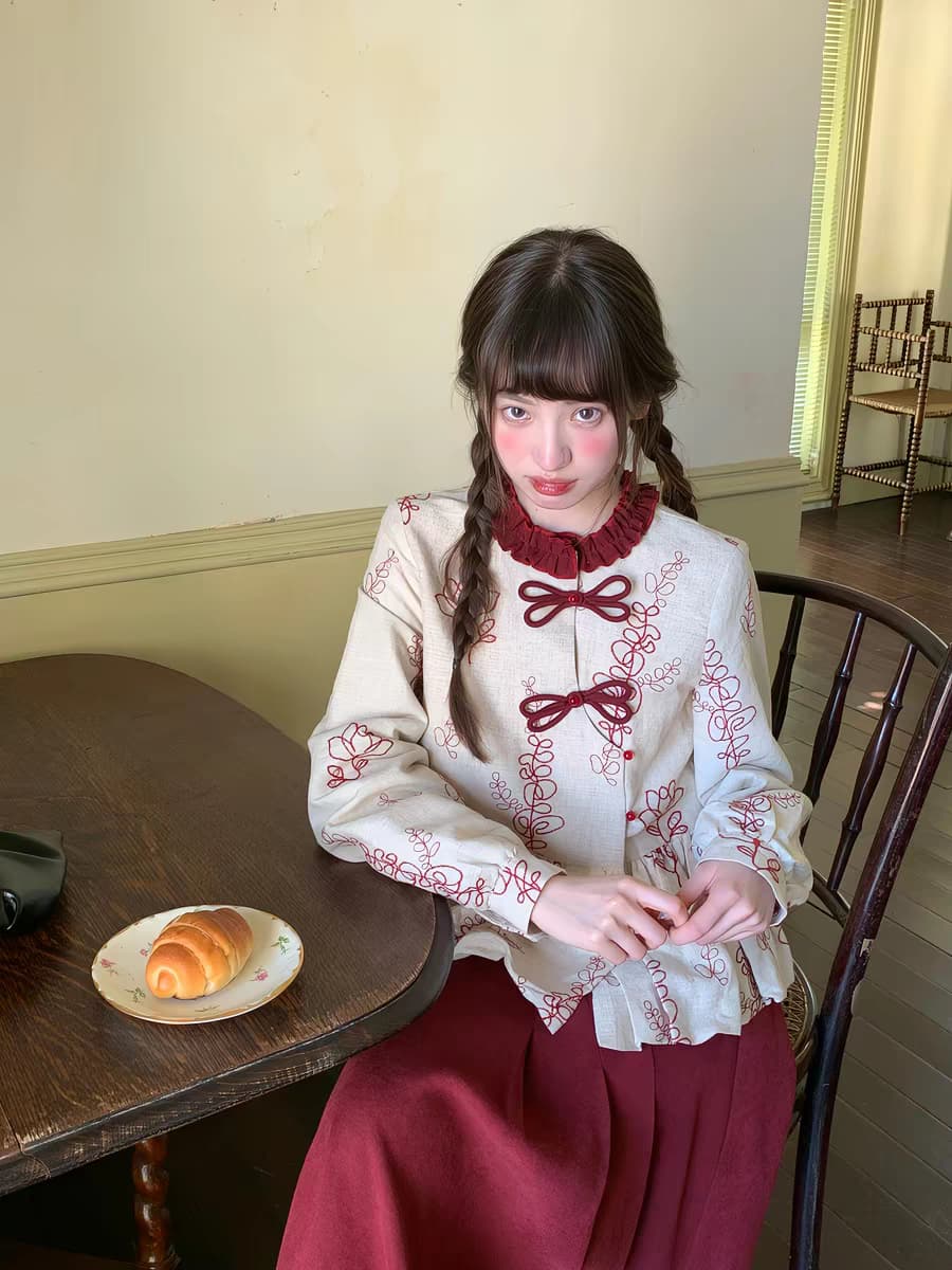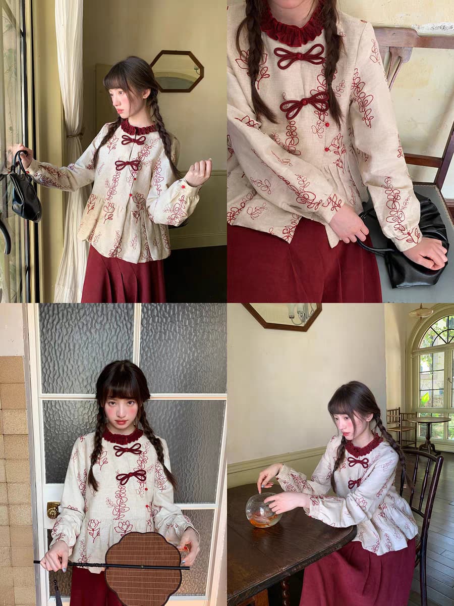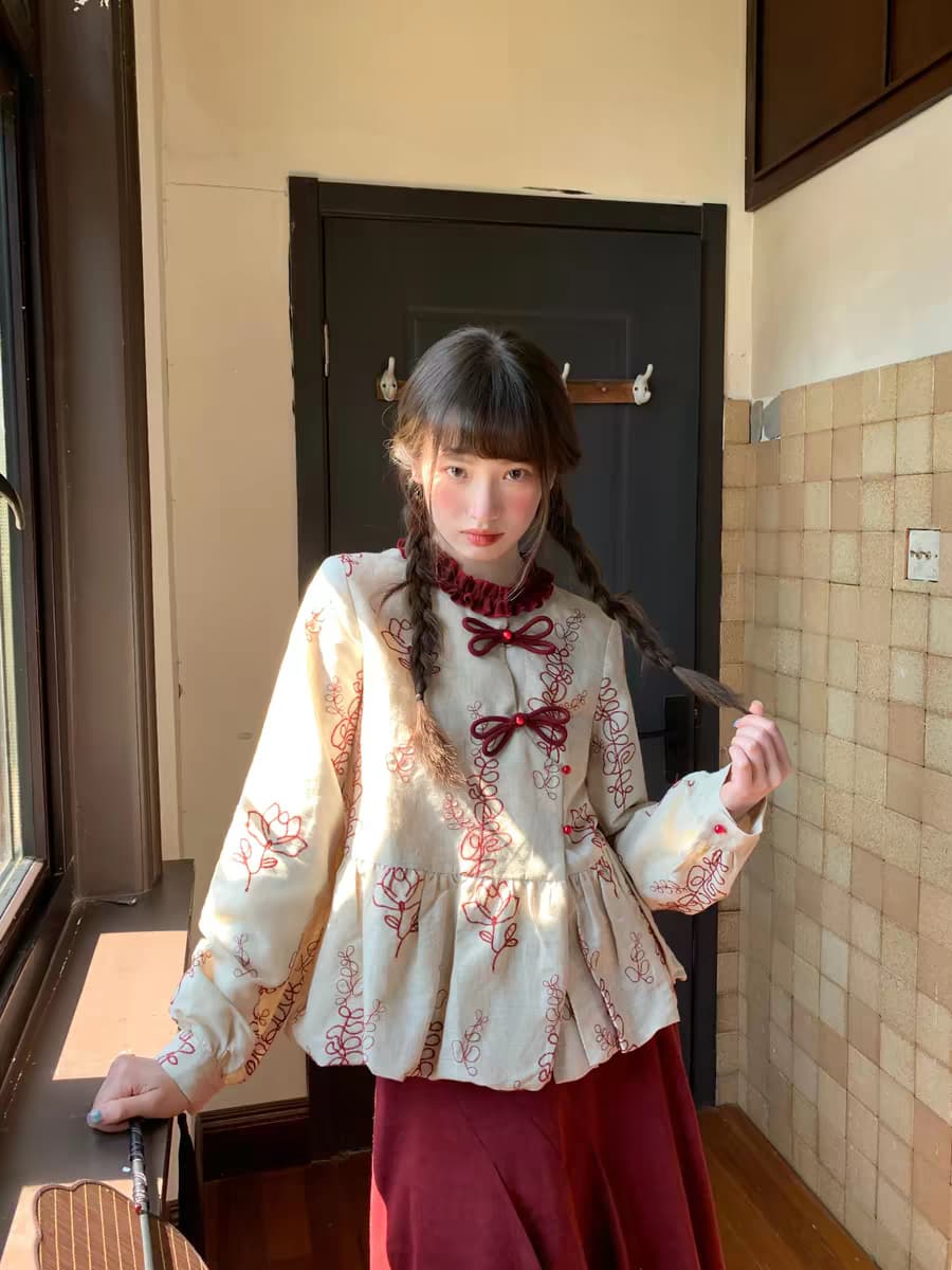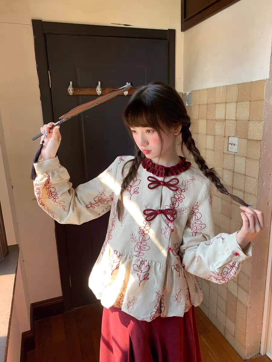 Китайская блузка CHEESEDAY с вышивкой «Хайтан». Топ/кофта. Параметры модели: · Рост: 167 см, вес 44 кг, размер на модели S Состав: · Топ: 100% лен